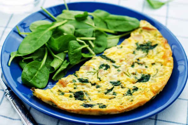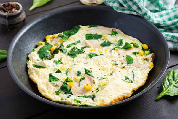 Popeye Omelette is an egg white omelette with turkey, spinach, broccoli, and swiss cheese.