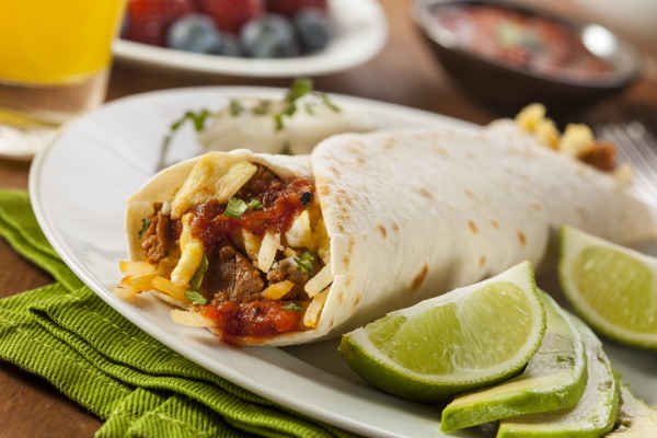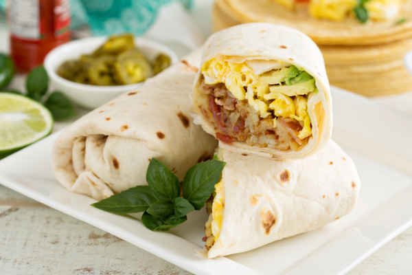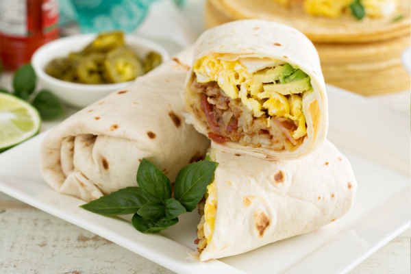 Burrito with egg white, turkey bacon, Swiss cheese and avocado.